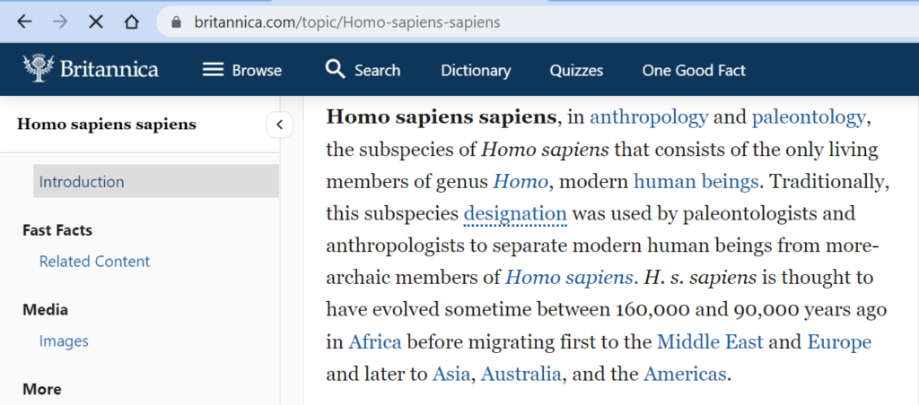According to Britannica, Homo sapiens sapiens, the subspecies of the homo sapiens, “is thought to have evolved sometime between 160,000 and 90,000 years ago in Africa before migrating first to the Middle East and Europe and later to Asia, Australia, and the Americas.”