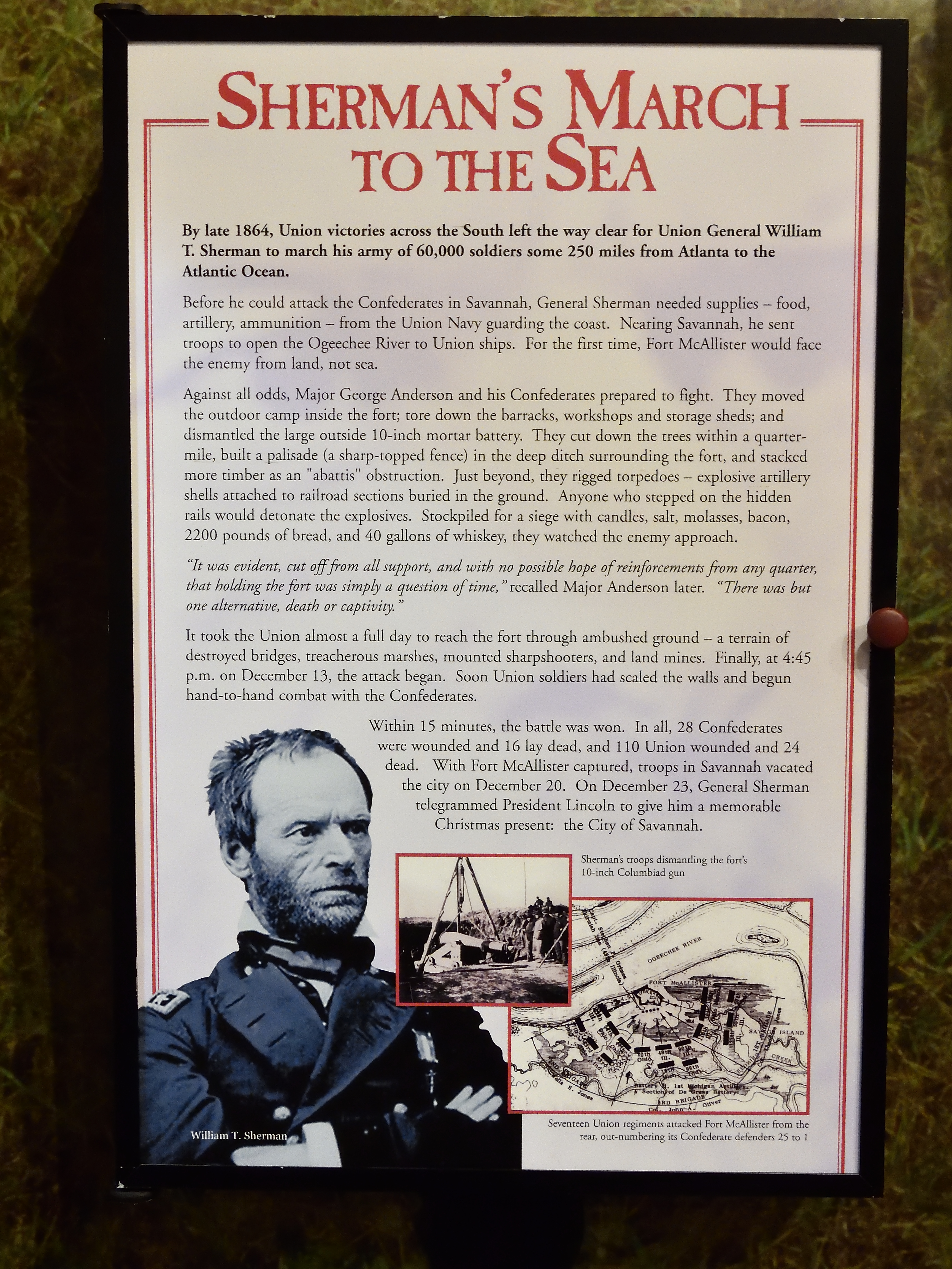 The fall of Fort McAllister was a decisive moment in Sherman’s campaign. It opened the Ogeechee River to Union naval forces, allowing Sherman’s army to resupply and communicate with the outside world. This victory effectively sealed the fate of Savannah, which surrendered without a fight on December 21, 1864. Sherman later presented the city to President Abraham Lincoln as a Christmas gift, marking the success of the “March to the Sea” and delivering a significant blow to Confederate morale and infrastructure.
