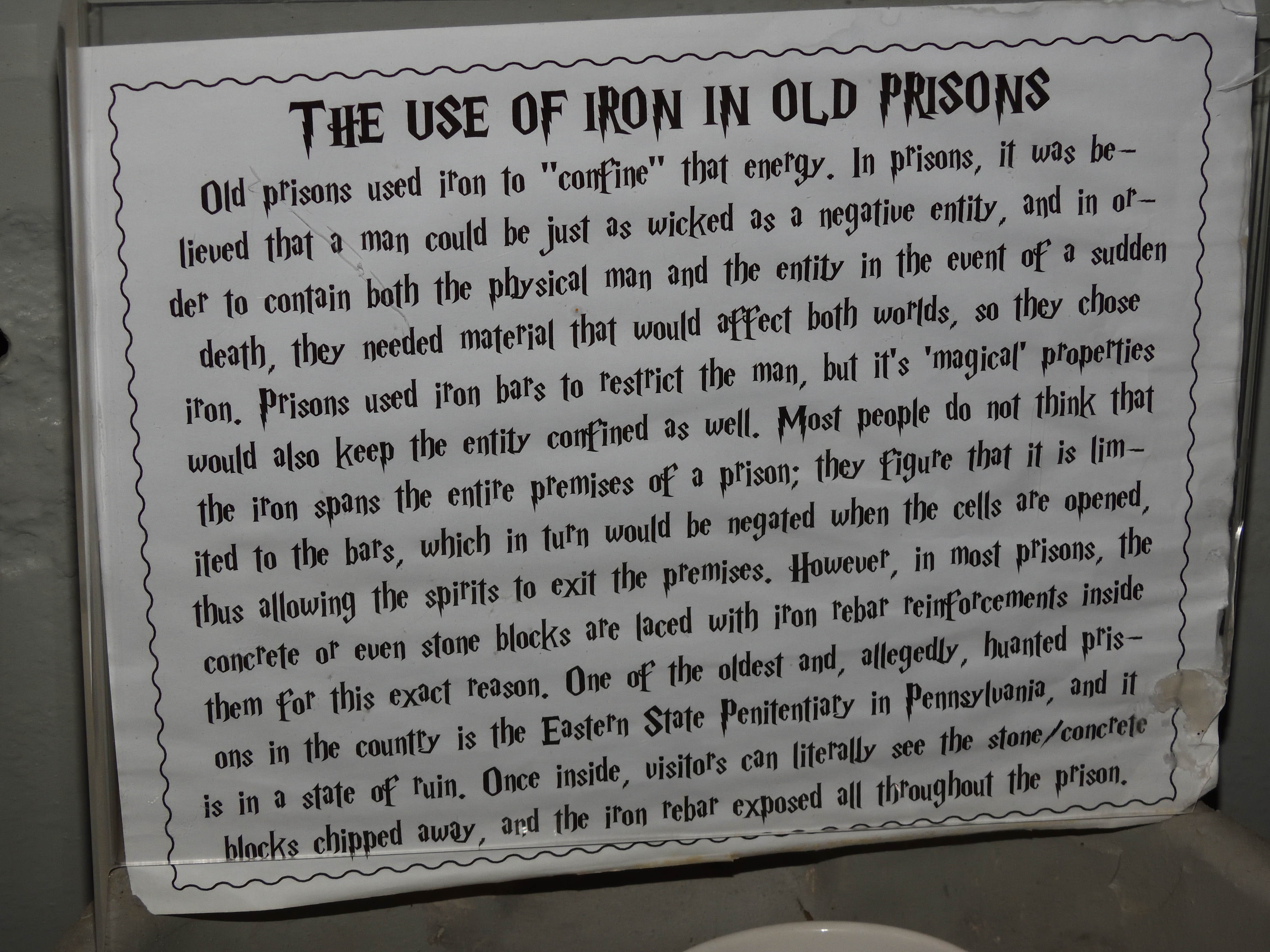 “The jail embodies the principles and conditions of incarnation prevalent at the turn of the 20th century. Due to the integrity of the structure and its setting, the social and humanitarian attitudes of its period are readily tangible today. Prisoner’s graffiti from the 1960s and early 1970s remains on several cell walls and may reveal information important to that period.” Quoted from “Proposed Guidelines For Restoration” – Suzanne Johnson- March 1990