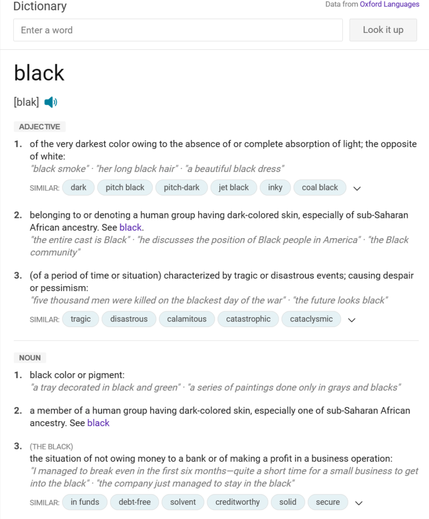 According to Oxford Languages, the term “black” encompasses various definitions. However, specifically when referring to a group of people, it often denotes individuals with dark skin, particularly those of sub-Saharan African descent. Additionally, one of the definitions also includes the concept of the color or pigment black. The black pigment can range from light brown to very dark brown.
