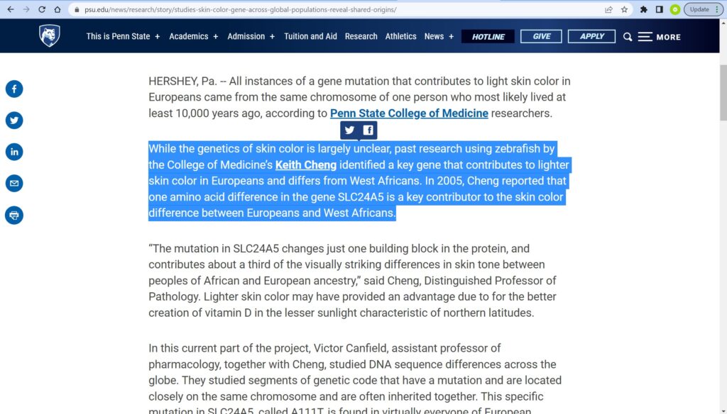 Dr. Keith Cheng, a distinguished professor of pathology at Penn State, and colleagues “identified a key gene that contributes to lighter skin color in Europeans and differs from West Africans. In 2005, Cheng reported that one amino acid difference in the gene SLC24A5 is a key contributor to the skin color difference between Europeans and West Africans.”