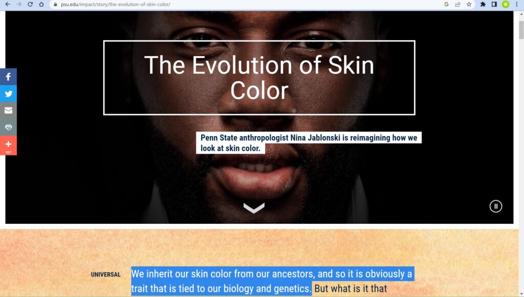 Ever since I can remember, I have been told repeatedly that humanity began its adventurous life in Africa, possibly as far back as 6 million years ago. And when it comes to our ancestors, I’ve learned from Penn State Researchers that “We inherit our skin color from our ancestors, and so it is obviously a trait that is tied to our biology and genetics.”