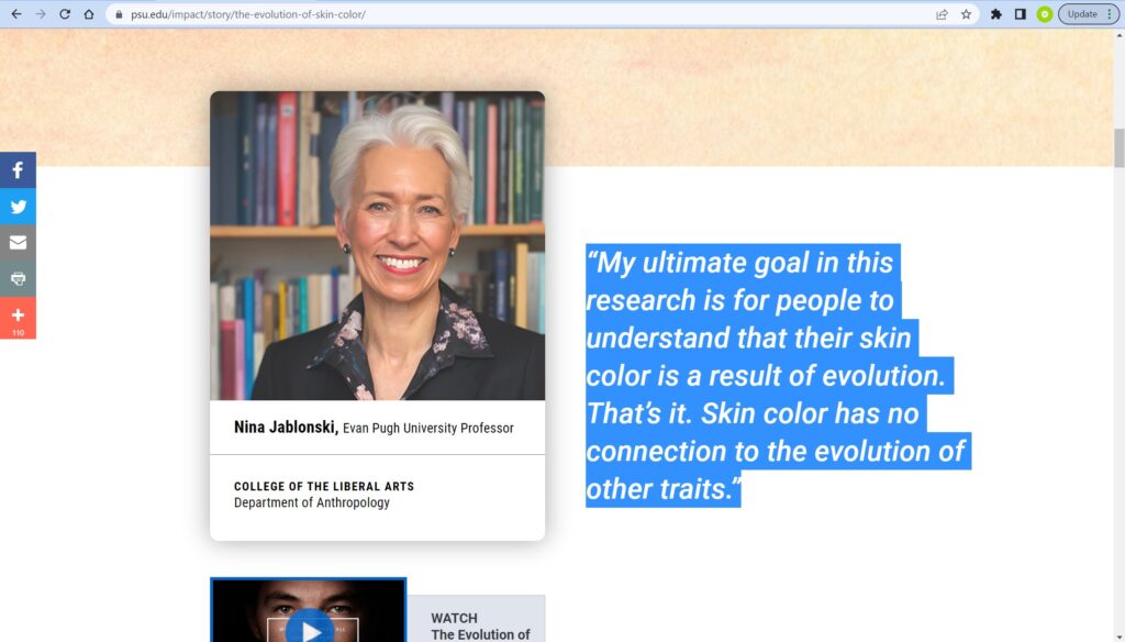 Nina G. Jablonski, Evan Pugh University Professor of Anthropology at The Pennsylvania State University, says, “My ultimate goal in this research is for people to understand that their skin color is a result of evolution. That’s it. Skin color has no connection to the evolution of other traits.”