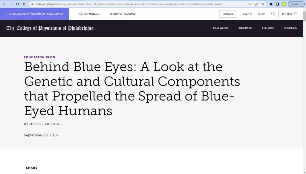 According to The College Of Physicians Of Philadelphia (Behind Blue Eyes: A Look at the Genetic and Cultural Components that Propelled the Spread of Blue-Eyed Humans BY MÜTTER EDU STAFF), “The Neolithic Revolution occurred between 6,000-10,000 years ago, and because people were better able to procure a steady source of food, the population increased significantly. The technologies which emerged during this time allow archaeologists and researchers to track cultural migration from the northwestern part of the Black Sea region (where the first humans with blue eyes lived) into the rest of Europe.”
