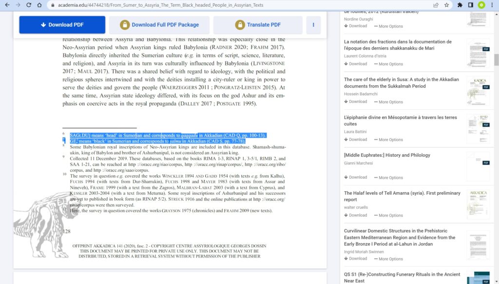 According to Mattias Karlsson, From Sumer to Assyria: The Term “Black-headed People” in Assyrian Texts, “The people of ancient Sumer are sometimes referred to as ‘black-headed people’ (Sumerian sag-ge; Akkadian salmat qaqqadi) in Sumerian texts. This term is, for example, attested in the so-called Neo-Sumerian Period. In one of the royal hymns of Shulgi (ca 2094-2047 BCE), The said ruler is described as ‘the herdsman (na-gada)and shepherd (sipad) of the black-headed people.”