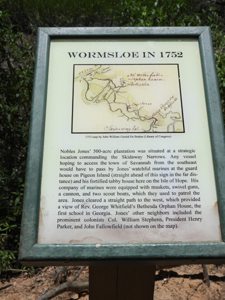 As settlers could not purchase land in the colony, Jones leased 500 acres of land from the Georgia Trustees in 1736. Located roughly ten miles southeast Savannah, Jones completed construction on his fortified tabby home, Wormsloe (originally spelled “Wormslow”) in 1745. The fortified house was used as an outpost for a company of marines commanded by Jones, to patrol Savannah’s outer defenses in case of an attack from the Spanish. During the War of Jenkins’ Ear (1739-1748), Jones aided Oglethorpe during the British siege of St. Augustine. Jones and his scouts provided key intelligence to Oglethorpe to defeat the Spanish on St. Simons Island at the Battle of Bloody Marsh. In 1756, King George II formally granted Jones the ownership of Wormsloe. During the 1750s, Jones oversaw the cultivation rice, indigo, and silk at Wormsloe Plantation. Throughout the Trustees Period of Georgia’s history (1732-1752) and after Oglethorpe’s departure to Great Britain, Jones was a constant supporter of the King and held several offices in the colony. This placed him in opposition to his son, Noble Wymberly Jones, who supported the patriot cause during the American Revolution. When Jones died in 1775, Wormsloe passed first to his daughter, Mary, and later to his son, Noble Wymberly Jones.